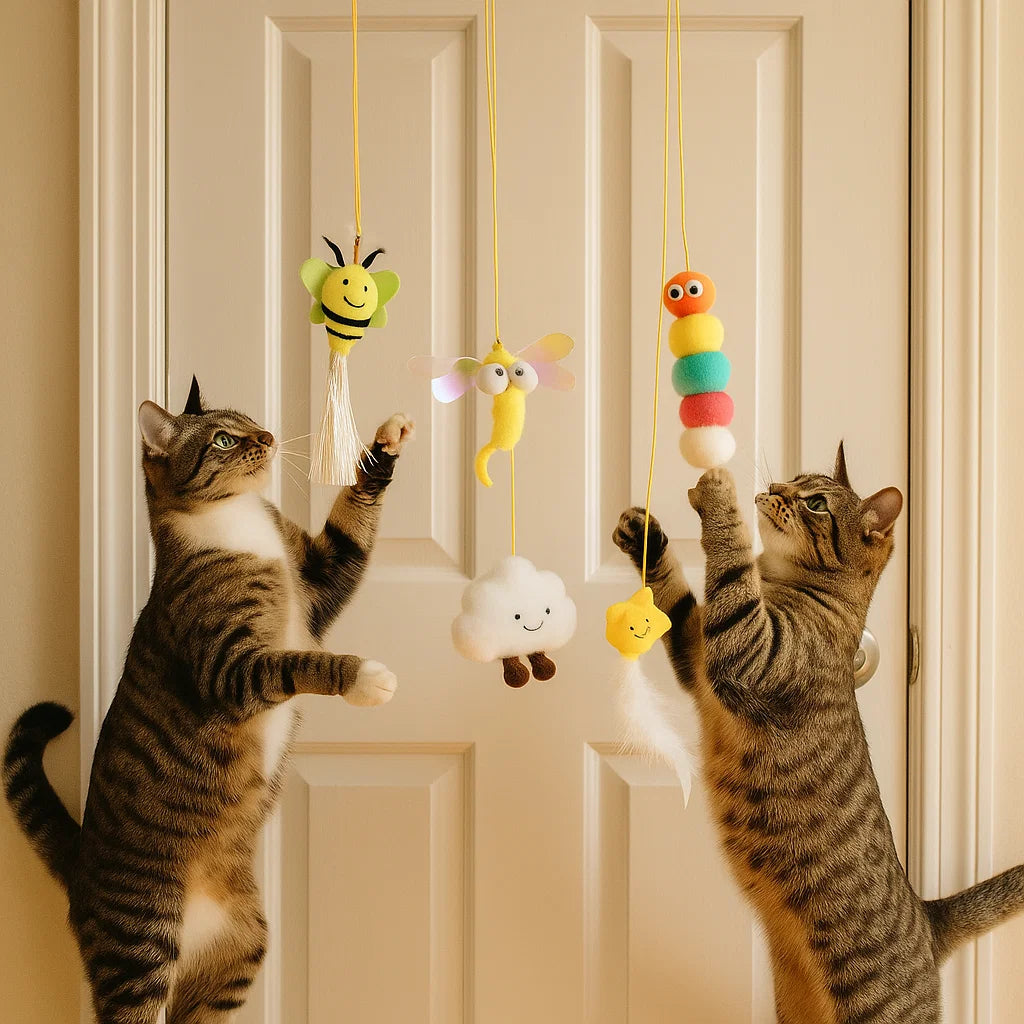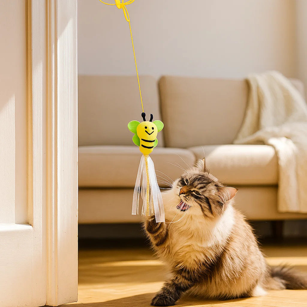 Gør leg til en uundværlig del af din kats hverdag med Katte legetøj hængende på døren. Det fjederende legetøj med fjer og klokke er designet til at aktivere din kats naturlige jagtinstinkter – og samtidig give masser af sjov og motion, uden at fylde i hjemmet.